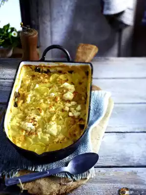Spread the remaining potatoes on top and pour the rest of the sauce over it. Sprinkle with 100 g cheese and bake in the preheated oven (electric cooker: 175 °C/ convection oven: 150 °C/ gas: see manufacturer) for 60-70 minutes.