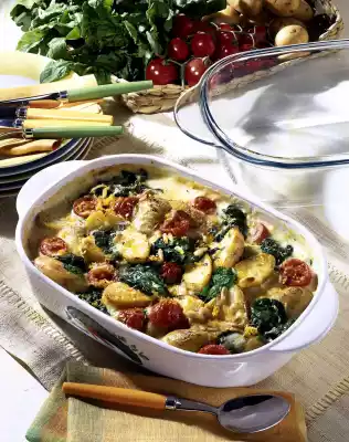 Place the potatoes with spinach and cherry tomatoes in an ovenproof casserole dish with lid. Season with salt and pepper. Pour over the béchamel. Finely grate the Parmesan cheese. Spread the parmesan with lemon zest and pine nuts on the casserole dish and cover with the lid.