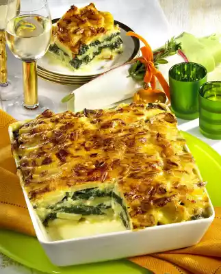 Grease a large casserole dish (approx. 35 cm long). Spread some sauce on the bottom of the dish. Layer potatoes, spinach and sauce alternately. Finish with potatoes and sauce. Sprinkle with remaining cheese and pine nuts. Bake lasagne in the preheated oven (electric cooker: 200 °C/circulating air: 175 °C/gas: level 3) for approx. 45 minutes