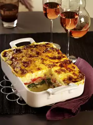 Alternately layer spinach and tomatoes with some sauce. Finish with sauce and remaining cheese. Bake in a hot oven (electric cooker: 200 °C/circulating air: 175 °C/gas: level 3) for 45-50 minutes.