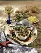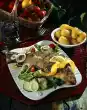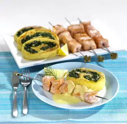 Roll up from the long side and cut into 12 slices with a sharp knife. Heat the fat in a pot and fry the rest of the onion in it until transparent. Dust with 25 g flour, sauté, deglaze with stock and cream while stirring constantly, bring to the boil. Season to taste with salt, pepper, sugar and 2-3 tablespoons lemon juice. Remove from the heat, whisk 1 egg yolk and stir into the hot sauce. Keep warm. Heat 1 tablespoon of oil in a large coated frying pan, fry 6 potato slices in it on each side for about 2 minutes at medium heat. Keep warm. Heat 1 tablespoon of oil and fry the remaining potato slices in the same way. Heat 2 tablespoons of oil in a frying pan, add fish skewers and fry for approx. 1 minute on each side (4 minutes in total). Season with salt and pepper. Arrange skewers, potato slices and some sauce on a plate. Garnish with lemon slices and dill flags. Add the rest of the sauce extra