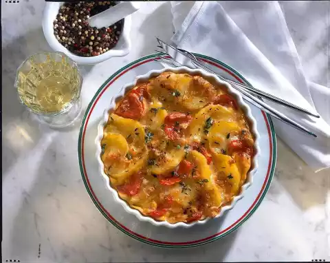 Crumble or chop the cheese very finely. Whisk cheese, milk, eggs and mustard. Season with salt and pepper. Cut potatoes into slices. Layer potato slices and tomato pieces in a greased casserole dish.