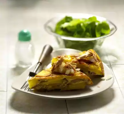 Pluck the tuna into small pieces, add 2/3 of it, mix in. Whisk eggs, season with salt and pepper. Pour evenly over the potato pan. Leave to stand on a low heat for 15-20 minutes.
