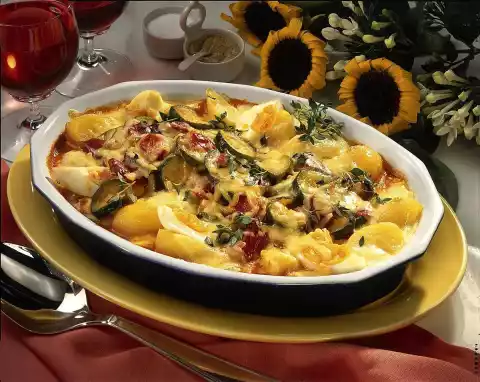 Gradually stir in cream and 1/4 litre potato water. Bring to the boil again and let it swell for about 10 minutes over a mild heat. Cut the eggs into slices. Add potatoes and eggs to the sauce. Season with salt and pepper. Put deep-frozen vegetables unfrozen in a pot with 100 ml water and bring to the boil. Cook in a closed pot at low heat for 3-5 minutes. Stir several times. Pluck the thyme leaves from the stems and add to the vegetables. Grate cheese. First put the béchamel potatoes in an ovenproof dish.
