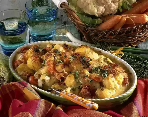 Mix the potatoes, vegetables, spring onions and ham and place in a greased casserole dish. Heat the fat in a pot and sauté the flour in it. Add vegetable water and milk while stirring, bring to the boil and simmer for about 5 minutes.