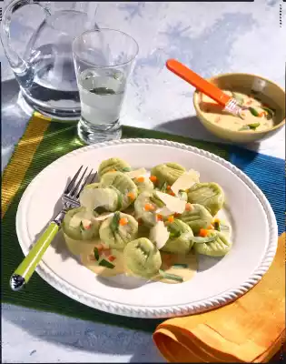 Cut it into approx. 2 cm thick pieces, form them into balls and press them in with a fork as desired. Let the gnocchi simmer in boiling salt water for about 5 minutes. Wash tarragon, dab dry and pluck. Remove the gnocchi, rinse in cold water, drain and warm in the sauce. Sprinkle with the tarragon. Arrange on plates, slice the remaining Parmesan finely and sprinkle over the gnocchi.