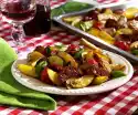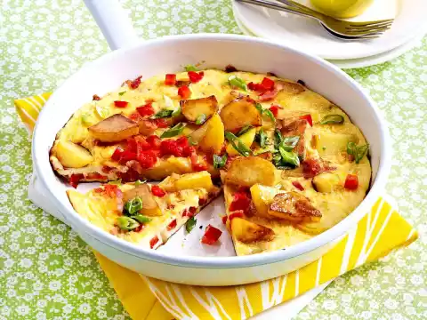 Heat 1 tablespoon of oil in each of two pans (24 cm Ø) and fry half of the potatoes for about 15 minutes while turning. Add half bacon after about 10 minutes. Divide the bell peppers and spring onions between the pans and fry briefly. Carefully pour the egg mixture over them. Put the lid on the pans. Let the mixture set at low heat for 12-15 minutes