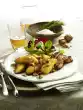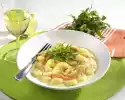 Meanwhile wash the herbs, shake dry and chop finely. Stir curd and 3 tbsp. milk until smooth. Peel onion and garlic and grate finely into the quark. Add herbs and season with salt, pepper and nutmeg. Arrange the omelette and add the herb quark