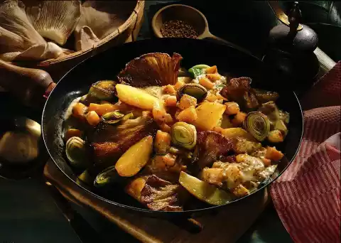 Add the leek. Season with salt and pepper. Fry for another 10 minutes. In the meantime peel and chop the onion. Clean and wash the oyster mushrooms. Heat the remaining oil in another pan. Fry the onions and oyster mushrooms in it at medium heat for about 5 minutes. Stir the crème fraîche, mustard and 1/8 litre water into the potato pan. Bring to the boil briefly and season to taste again.