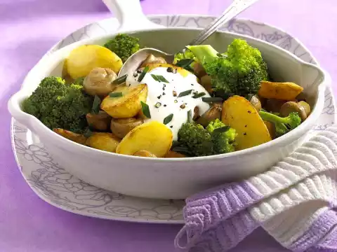 Clean and wash broccoli and cut into florets. Cook in boiling salted water for 6-8 minutes. Clean and wash the mushrooms. Peel, wash and halve the potatoes. Heat oil in a coated pan.