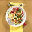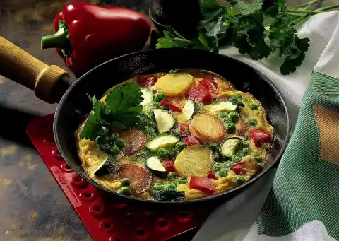 Whisk eggs and milk. Stir in paprika powder. Pour over the vegetables, cover and allow to set at medium heat for approx. 15 minutes. Serve garnished with parsley.