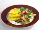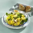 Wash the potatoes and cook in boiling salted water for about 15 minutes. In the meantime defrost the peas. Clean and wash peppers and zucchini. Dice the bell peppers and cut the zucchini into halves.