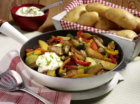 Season sour cream with salt, pepper, sugar and basil, except for a little to garnish. Remove potatoes from the pan and keep warm. Fry the prepared vegetables in the frying fat for about 10 minutes, turning.