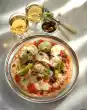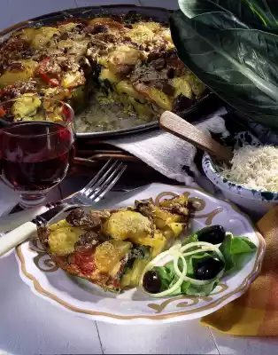 Fry the mushrooms in hot fat. Steam chard briefly. Season with salt, pepper and herbs. Place the potato and tomato slices in a greased ovenproof pan or quiche dish (Ø approx. 26 cm)