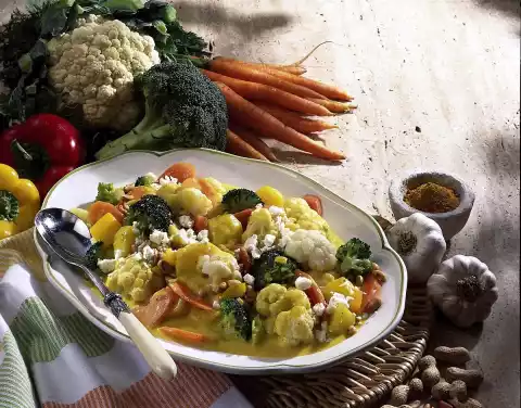 Wash the potatoes thoroughly, peel, dice coarsely and cook in boiling salted water for about 18 minutes. Cook cauliflower in boiling salted water for about 15 minutes. After about 5 minutes of cooking time add broccoli and carrots.