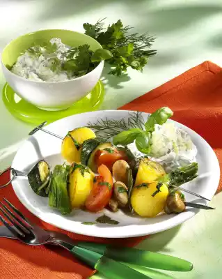Season to taste with salt and pepper. Serve skewers and herb quark garnished with fresh herbs.