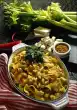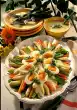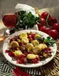 Wash the potatoes and cook in boiling water for 15-20 minutes. Then rinse with cold water, peel and cut in half. In the meantime clean and wash the tomatoes, zucchini, spring onions and mushrooms.