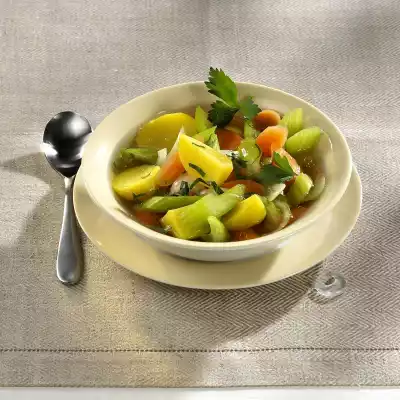 Halve the onion and cut into slices. Heat the oil in a pot. Sauté vegetables and potatoes in it. Pour in broth, cover and cook over a mild heat for about 20 minutes. Wash parsley, dab dry, put some leaves aside for garnishing.