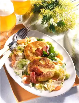 Add carrots and steam for another 3 minutes. Stir in sour cream. Let it boil down open for another 2 minutes. Season with salt, pepper and nutmeg. Arrange savoy cabbage, carrot and vegetables and potato cookies on a plate and garnish with the remaining parsley.