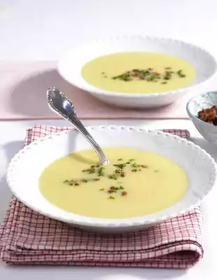 Finely puree the soup. Stir in cream and bring to the boil again briefly. Season to taste with salt and pepper. Sprinkle with chives and bacon cubes