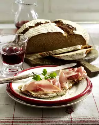 Dust fermenting baskets well with flour, add loaves. Cover and leave to rise in a warm place for about 1 hour. Carefully turn out 1 loaf of bread dough onto a baking tray lined with baking paper. Bake in a preheated oven (electric cooker: 225 °C/ convection oven: 200 °C/ gas: level 4) for 35-45 minutes. Let them cool down. Bake the other bread in the same way. Cut the cooled bread into slices, brush with butter and cover with cold cuts