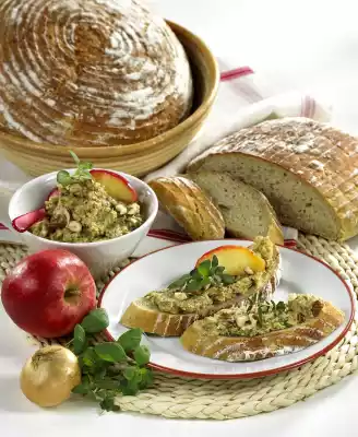 If the dough is too soft add some more flour. Cover the dough and let it rise in a warm place for 30-40 minutes. Knead the dough again, cut in half and form loaves. Dust the cooking baskets well with flour and add the loaves. Cover and leave to rise in a warm place for about 15 minutes. Carefully turn out the breads on 2 baking trays lined with baking paper. Remove baskets carefully. If necessary, refrigerate one more loaf of bread. Bake the other one in a preheated oven (electric cooker: 225 °C/ convection oven: 200 °C/ gas: level 4) for 40-45 minutes. Let it cool down. Bake the other bread in the same way. For the spread, crumble the bay leaf. Finely chop nuts, bay leaf, thyme and marjoram in the universal chopper. Peel, quarter and core the apple. Cut into very small cubes. Peel onions and garlic cloves, dice very finely. Heat 40 g butter in a frying pan, fry onion and garlic in it until transparent. Add apple cubes and fry everything until golden brown.