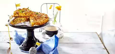 Wash the marjoram, shake dry, pluck the leaves from the stalks. Remove the quiche from the oven and let it rest for about 10 minutes. Carefully remove the quiche from the mould and arrange on a plate, sprinkled with marjoram.