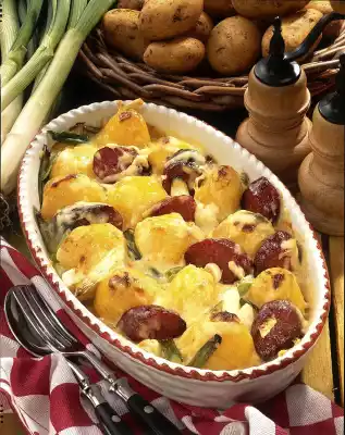 Season with salt and pepper. Cut the cabanossi diagonally into slices. Drain potatoes, rinse with cold water and peel. Put the potatoes, spring onions and cabanossi in a flat casserole dish. Pour cheese sauce over it. Sprinkle with Gouda. Bake in a preheated oven (electric: 200 ° C / gas: level 3 25-30 minutes