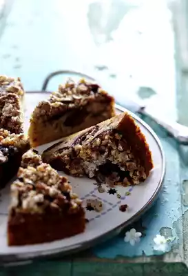 In the meantime, wash the plums, cut them in half and stone them. Spread the plums on the cake after about 10 minutes. Sprinkle with remaining nuts and 4 tablespoons of sugar