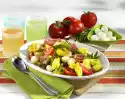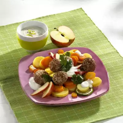 Arrange salad with meatballs and yoghurt sauce in portions. Serve garnished with lime.