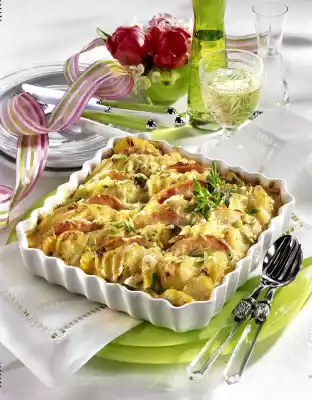 Season the sauce with pepper and nutmeg. Drain the potatoes, rinse with cold water and peel. Cut the potatoes into slices and layer them together with the celery slices in a fan shape in a flat, greased casserole dish.