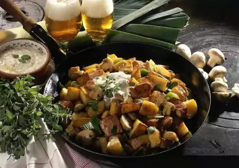 Heat half the clarified butter in a large pan. Sauté the meat briefly while turning. Fry the onions together with the meat. Take out. Fry the leek and mushrooms in the cooking fat, season with salt and pepper and remove from the pan. Add the remaining clarified butter to the frying fat. Fry the potatoes in it in two portions one after the other. Season with pepper and a little salt. Fry all potatoes at low to medium heat, turning occasionally, for about 20 minutes (add dried marjoram already when seasoning the potatoes). Wash the fresh marjoram, dab dry and pluck off the leaves, except for a little to garnish. Add meat, leek, mushrooms and fresh marjoram to the potatoes about 5 minutes before the end of the frying time. Stir in mustard.