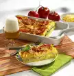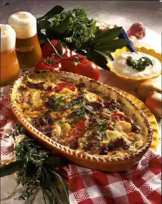 Layer the minced meat and tomatoes on the potatoes. Spread crème fraiche on top. Sprinkle with grated cheese. Bake in the preheated oven (electric oven: 200 °C/ gas: level 3) for 50-60 minutes. Cover if necessary.