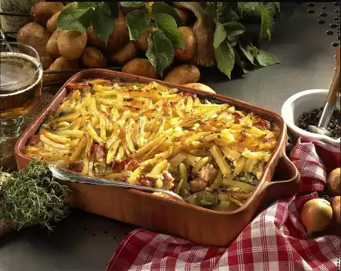 Mix in half of the potato pegs and season with salt, pepper and thyme. Put them into a greased casserole dish and spread the remaining potatoes on the mixture. For the glaze, mix milk, eggs, cheese, some salt and pepper and pour evenly over the potato crust. Bake in the preheated oven (electric: 200 °C / gas: level 3) for 50-60 minutes