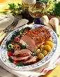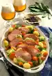 Season with salt and pepper and continue to fry over a low to medium heat for about 10 minutes. Turn in between. Remove the finished fillet from the pan and let it cool down. Add 15 g butter to the hot frying fat and fry the onion briefly. Add chanterelles and fry for 4-5 minutes. Add thyme and season with salt and pepper. Dust the chanterelles with flour, add stock and cream, bring to the boil and simmer for 4-5 minutes, stirring continuously. Add meat juice from the pork fillets and season to taste with salt and pepper. Drain the potatoes, rinse with cold water and peel. Dice the potatoes and place them in a flat ovenproof dish as a wreath. Cut pork fillets into slices, place them in the middle and spread the chanterelle cream over them.