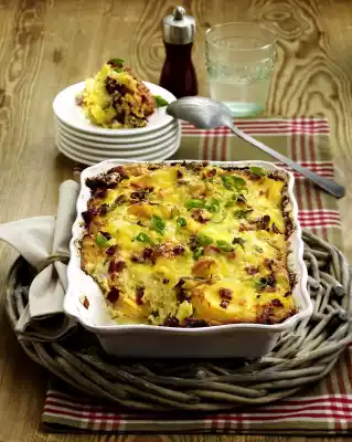 Carefully mix all ingredients except for a few spring onion rings for garnishing and place in a greased casserole dish. Bake in a preheated oven (electric cooker: 175 °C/ convection oven: 150 °C/ gas: level 2) for approx. 1 1/4 hours.
