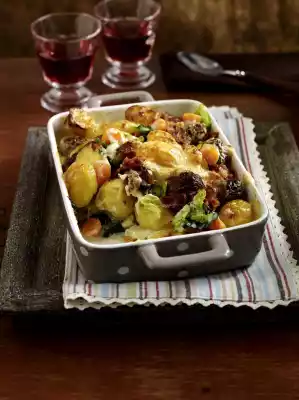 Melt the fat in a pot. Stir in flour and sweat briefly. Add stock and milk while stirring. Bring to the boil, let it boil for about 5 minutes, season with salt, pepper and nutmeg. Put potatoes, vegetables and meatballs in a greased casserole dish. Pour sauce over them and sprinkle cheese on top. Bake in a preheated oven (electric cooker: 200 °C/ convection oven: 175 °C/ gas: level 3) for approx. 30 minutes