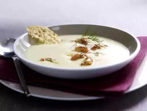 Arrange the soup and spread the crab meat on top. Garnish with dill and parmesan chips.