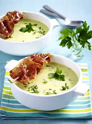 Puree the soup with a blender. Finally add the salad and puree again. Stir in the whipped cream and season to taste with salt, pepper and sugar. Serve the soup, sprinkle with chopped parsley and garnish with parsley leaves.