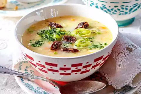 Finely mash the soup with a potato masher. Season to taste with salt and pepper. Serve with leek, croutons and chopped parsley.