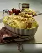 Peel the potatoes, weigh 250 g and set aside. Cream fat, 125 g sugar and eggs with the whisk of the hand mixer. Mix flour and baking powder. Press potatoes through a potato press to the flour. Then add the butter-sugar mixture and work into a firm dough with your hands. Put the dough in a cool place for about 10 minutes