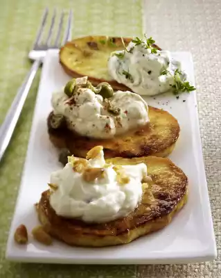 Season with salt and pepper. Remove and drain well on kitchen paper. Arrange potato crostini with the cheese dips.
