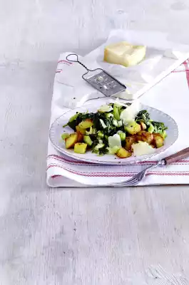 Finely slice the Parmesan cheese with a peeler. Arrange potatoes and vegetables on plates, sprinkle with parmesan.