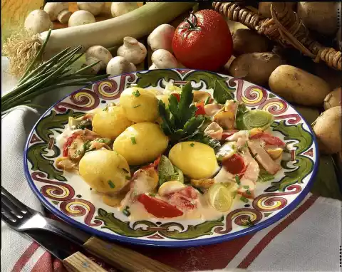 Brown the mushrooms and leek in it. Add tomatoes and sliced pork and cook for about 5 minutes. Stir in crème fraiche. Peel and chill the potatoes. Arrange vegetables and potatoes on a plate and sprinkle with chopped parsley
