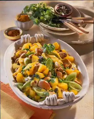 Season to taste with salt, pepper and curry. Add the potatoes, vegetables and meat to the sauce and warm up. Remove the coriander leaves. Add leaves and pumpkin seeds to the potato curry. Arrange on a deep plate and serve garnished with coriander as desired.
