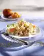 Coarsely chop the nuts, roast them in a pan without fat until golden brown, take them out. Wrap the roll out of the foil, cut into approx. 8 slices. Heat 2 tbsp. butter and 2 tbsp. oil in a large frying pan. Fry the slices on both sides. Serve with vegetables and sauce. Sprinkle with nuts. Sprinkle with herbs and garnish