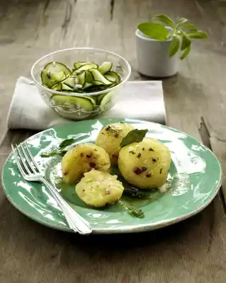 Cut the bacon into fine cubes and drain in a pan without fat. Wash the potatoes and cook them covered in plenty of boiling water for about 20 minutes. Wash cucumber and cut into fine slices with a slicer.