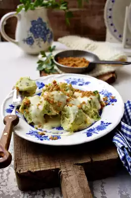 Melt 40 g fat in a pan. Add breadcrumbs and fry until golden brown. Lift the dumplings out of the water with a skimmer, drain well and arrange on 4 plates. Heat the cheese sauce, spread over the gnocchi and sprinkle with breadcrumbs.