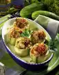 Wash chives, dab dry and cut into small rolls. Mix cream cheese and chives. Season with salt and pepper. Form 12 potato dumplings from the potato mixture, pressing a teaspoon of cream cheese into the middle of each. Turn the dumplings first in egg white, then in semolina. Fry in hot oil for 3-5 minutes until golden brown. Take out with a skimmer and drain on kitchen paper. Arrange 3 dumplings each with some red cabbage on a plate