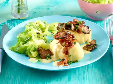 Steam the gnocchi for about 10 minutes with the lid closed. Heat 1 tablespoon of oil in a frying pan and sauté the pointed cabbage for 5-8 minutes. Wash chives, shake dry and chop finely. Arrange potato dumplings with sauce and pointed cabbage, sprinkle with chives and serve immediately.